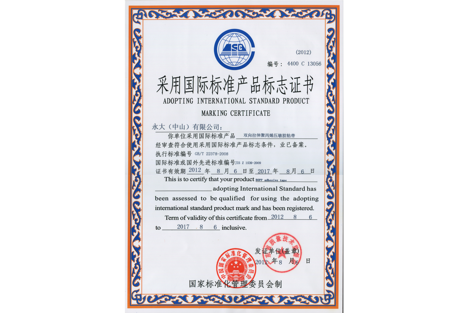 2023年*以第一起草人的身份承担“双向拉伸聚丙烯膜压敏胶粘带”行业标准的制定,还协助“胶粘带抗刺穿性能的测定”国家标准的制定